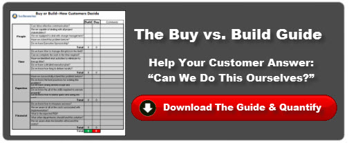 You mute the line. You swear. And then you realize this is reality. A common hurdle you face is overconfident customers. They think they can solve their problem on their own. The customer asks “Can we do it ourselves?” The Buy vs. Build Guide will help your team. The guide will enable your customer to quantify the choices and answer this question. Four benefits you and your team will receive:- Increase the probability of the customer choosing to buy.